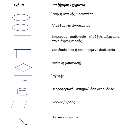 Για την απεικόνιση των Διαδικασιών του Εγχειριδίου Ποιότητας χρησιμοποιούνται σχήματα διαγραμμάτων ροής. Ακολουθεί η επεξήγηση των εμφανιζομένων σχημάτων στα διαγράμματα ροής των διαδικασιών που ακολουθούν.