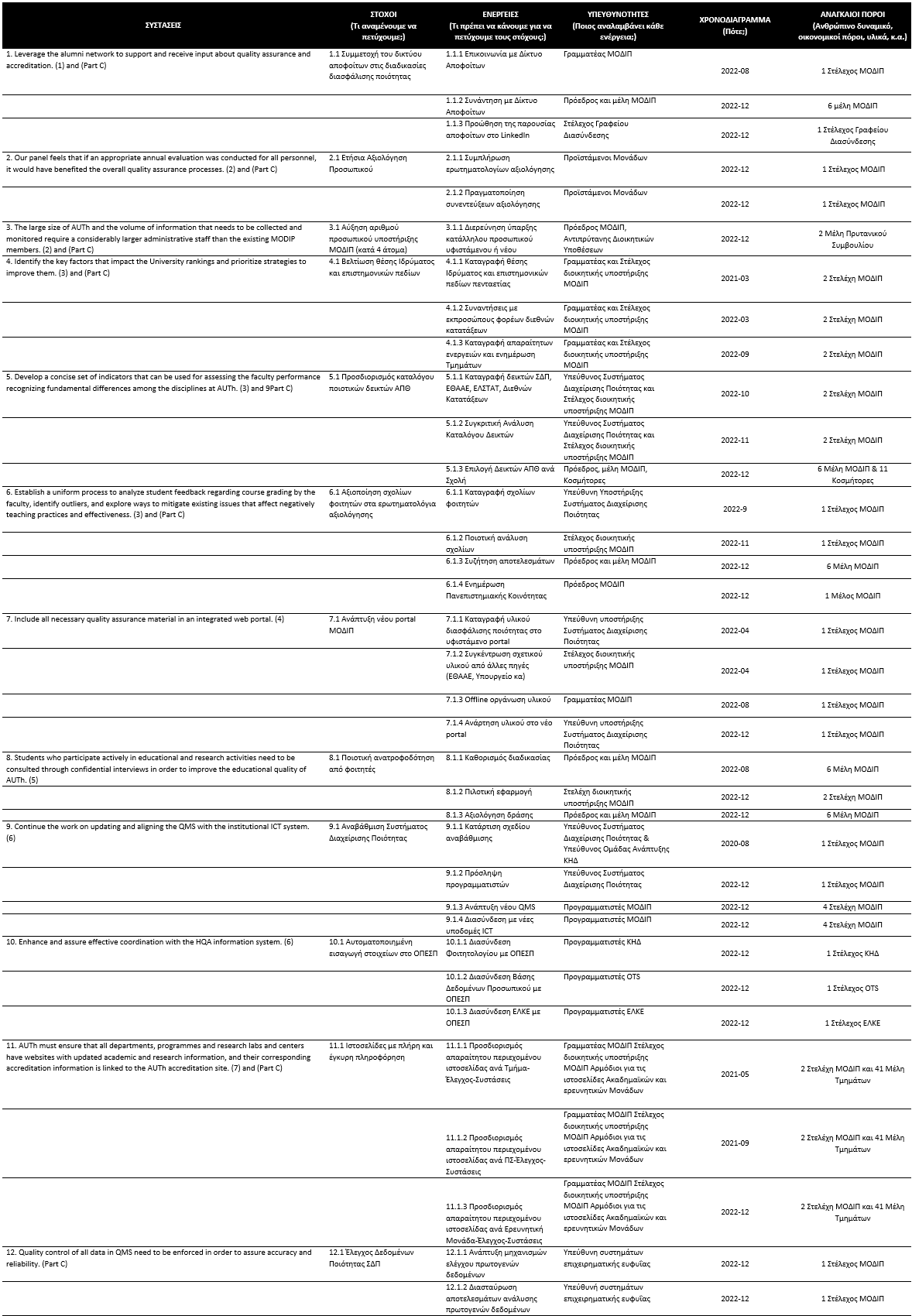 Με τα προαναφερθέντα δεδομένα (κυρίως των ιδιαίτερων συνθηκών λειτουργίας εξαιτίας της πανδημίας) θεωρήθηκε σκόπιμο και εκπονήθηκε ένα Σχέδιο Δράσης διετίας, συμπεριλαμβάνοντας μόνο τις συστάσεις εκείνες που άπτονταν αποκλειστικά της αρμοδιότητας του ΑΠΘ και που κρίθηκε τη δεδομένη περίοδο ότι θα ήταν εφικτό να υλοποιηθούν, ανεξάρτητα από τις τυχόν μεταβολές στο εξωτερικό περιβάλλον.