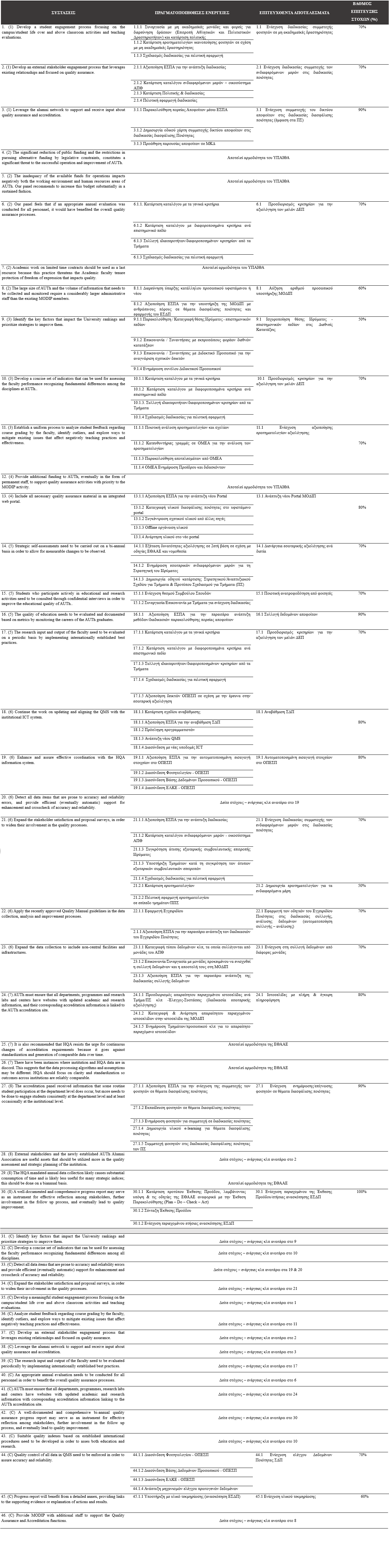 8. External Evaluation and Accreditation of the IQAS».Οι συστάσεις της ΕΕΑΠ επί όλων των Αρχών Ποιότητας, ανεξάρτητα από τις επιμέρους αξιολογήσεις, κρίθηκαν ως ιδιαίτερα εποικοδομητικές για το Πανεπιστήμιο, αν και στην πλειοψηφία τους μετέφεραν την τεχνογνωσία και την εμπειρία της ΕΕΑΠ από τα Πανεπιστήμια προέλευσης των μελών της, μη λαμβάνοντας υπόψη τις αδυναμίες του συστήματος της Ανώτατης Εκπαίδευσης στην Ελλάδα και ειδικότερα το περιοριστικό και συνεχώς μεταβαλλόμενο θεσμικό πλαίσιο, την υποχρηματοδότηση και την υποστελέχωση.